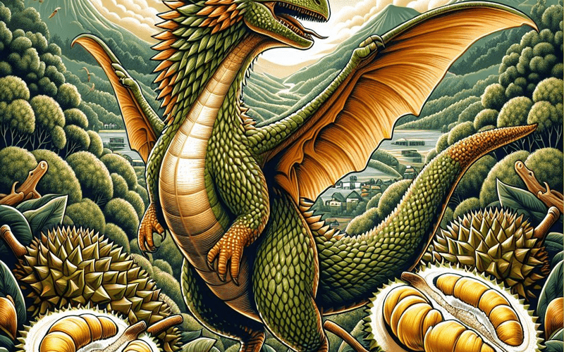 In the dense jungles of the Whisperwood Depths, a hidden realm within Vitamia where the air hangs heavy with the pungent aroma of exotic fruits and the sounds of unseen creatures echo through the thick foliage, there lumbers a creature of immense power and surprising gentleness – Duriasaur, the Durian Dinosaur. With scales the colour of a spiky durian and eyes that gleam with ancient wisdom, Duriasaur embodies the duality of the jungle, its roar a fearsome rumble that can shake the very ground, yet its touch as gentle as the falling rain. Its presence brings a sense of awe and respect to the depths, its energy a potent force that commands both fear and admiration.