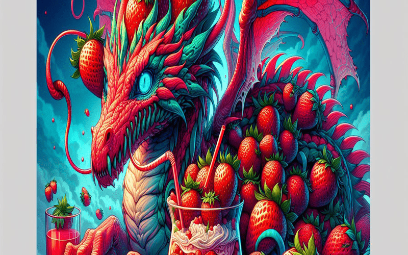 In the heart of the Valleys of Vitamia, where the sun-kissed meadows meet the whispering woods, there dwells a creature of vibrant hues and boundless energy – Strawgonus, the Strawberry Dragon. With scales the color of ripened strawberries and a mane of verdant leaves, Strawgonus embodies the very essence of the valley's vitality. Its eyes, like glistening dewdrop-laden berries, sparkle with mischief and an insatiable curiosity for the world around.